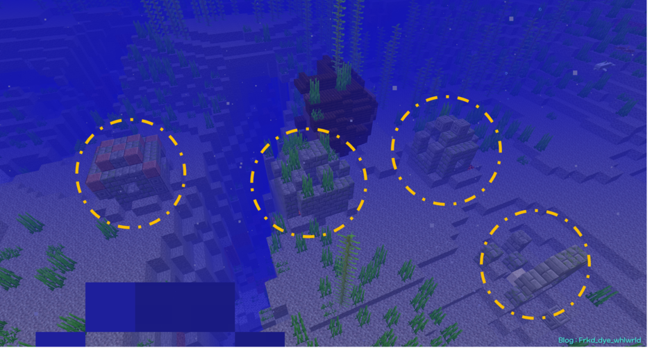 해저 폐허는 위의 사진의 동그라미 안에 표시된 구조물같이 바다에 생성되는 구조물 중 하나이다.