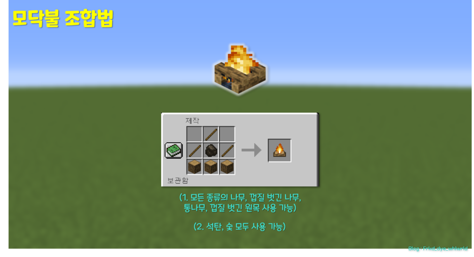 모닥불은 이전 7번째 공략에서 소개한 훈연기, 용광로와 같이 1.14버전에서 새로이 추가된 블록이다.