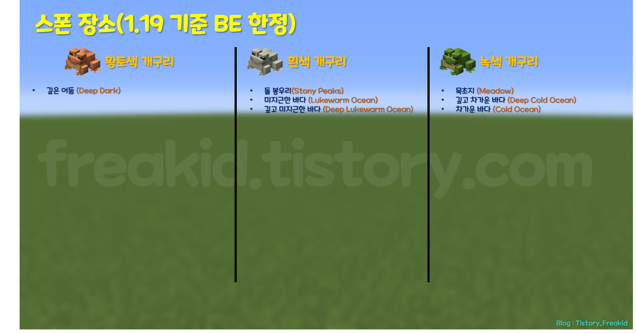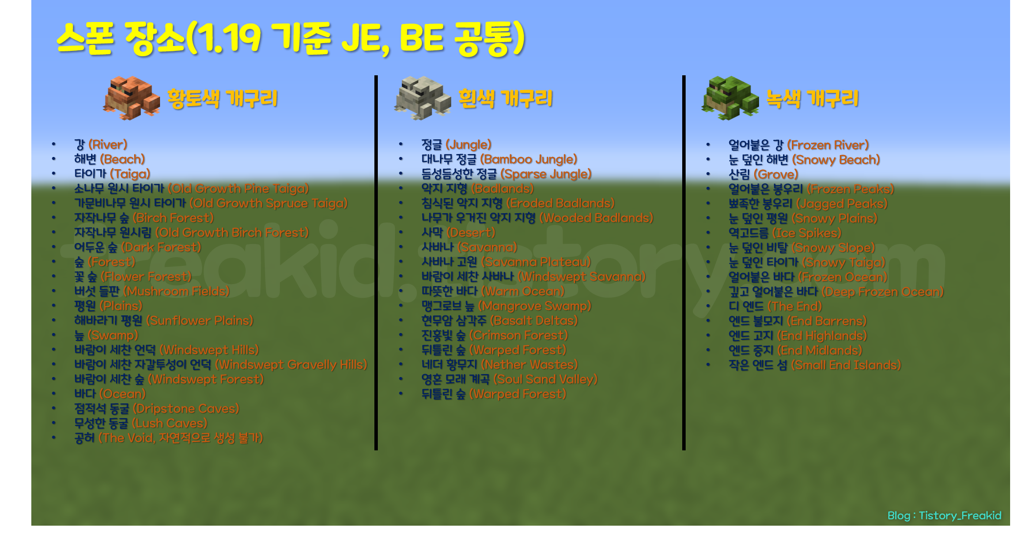 1.19 버전 업데이트 기준, 각 개구리가 스폰되는 바이옴은 아래와 같다.