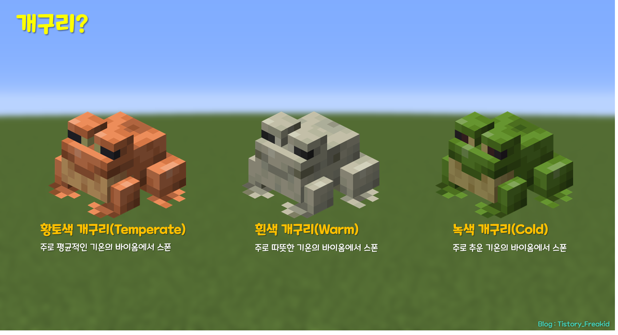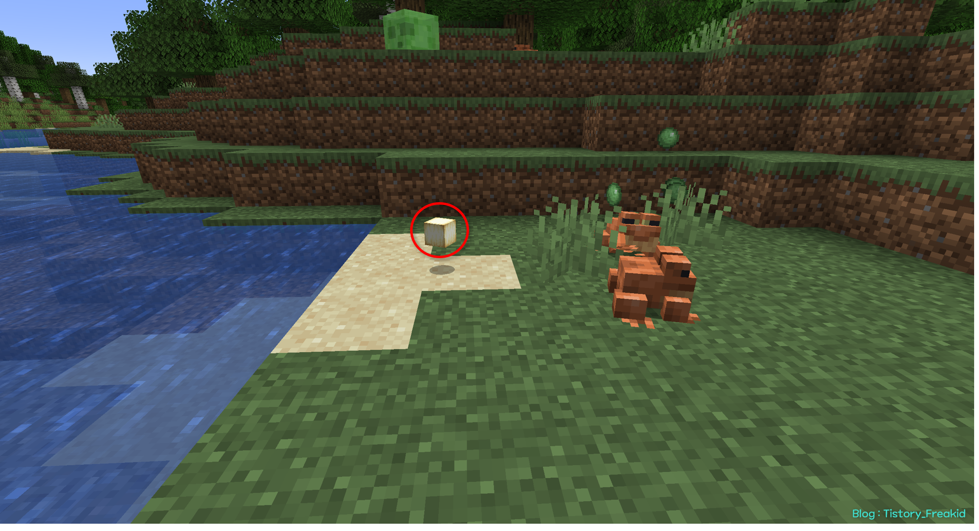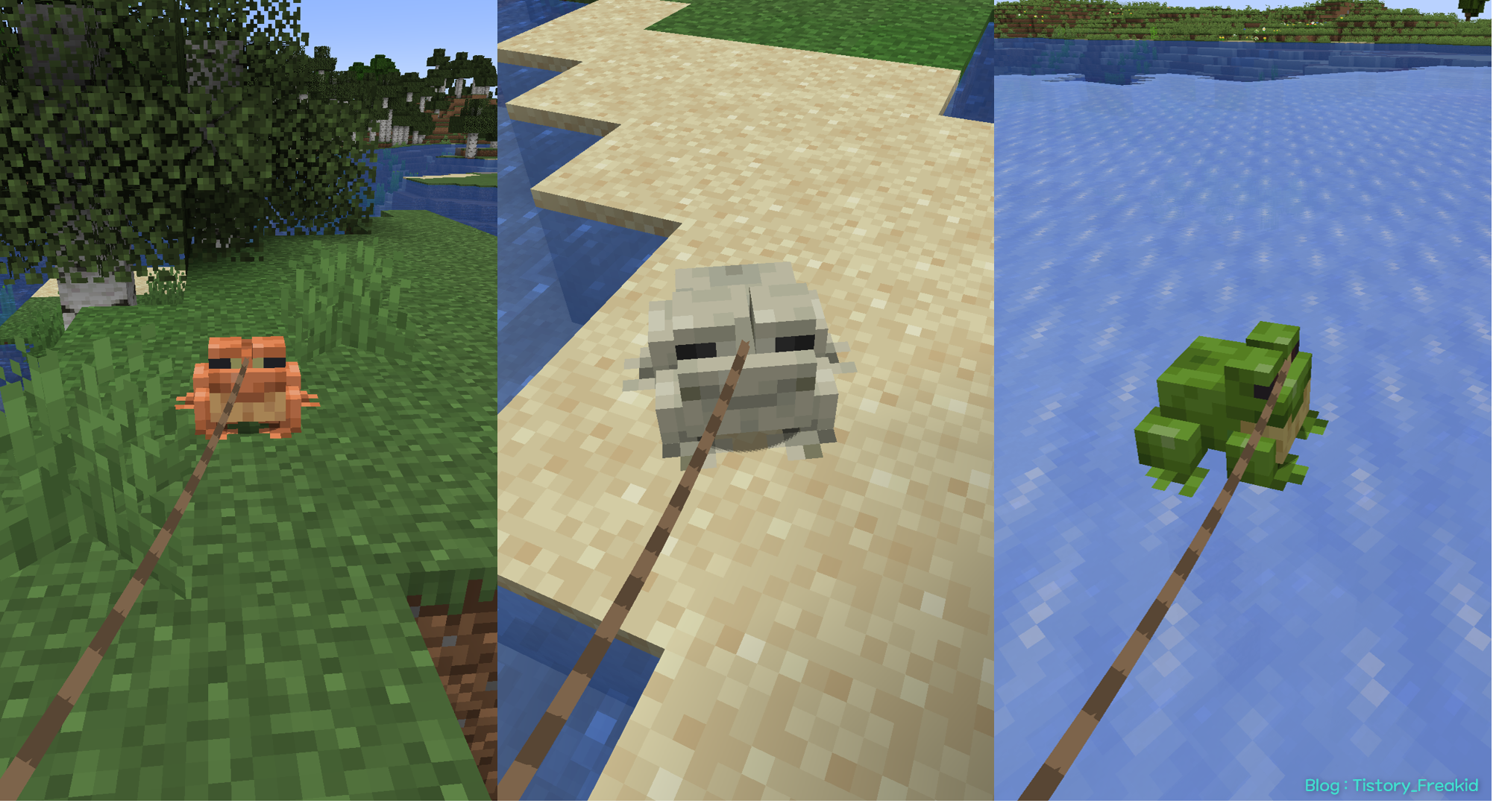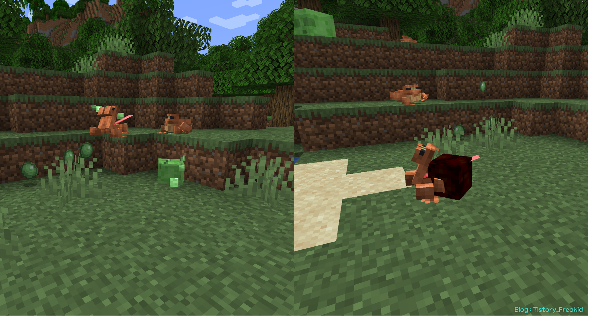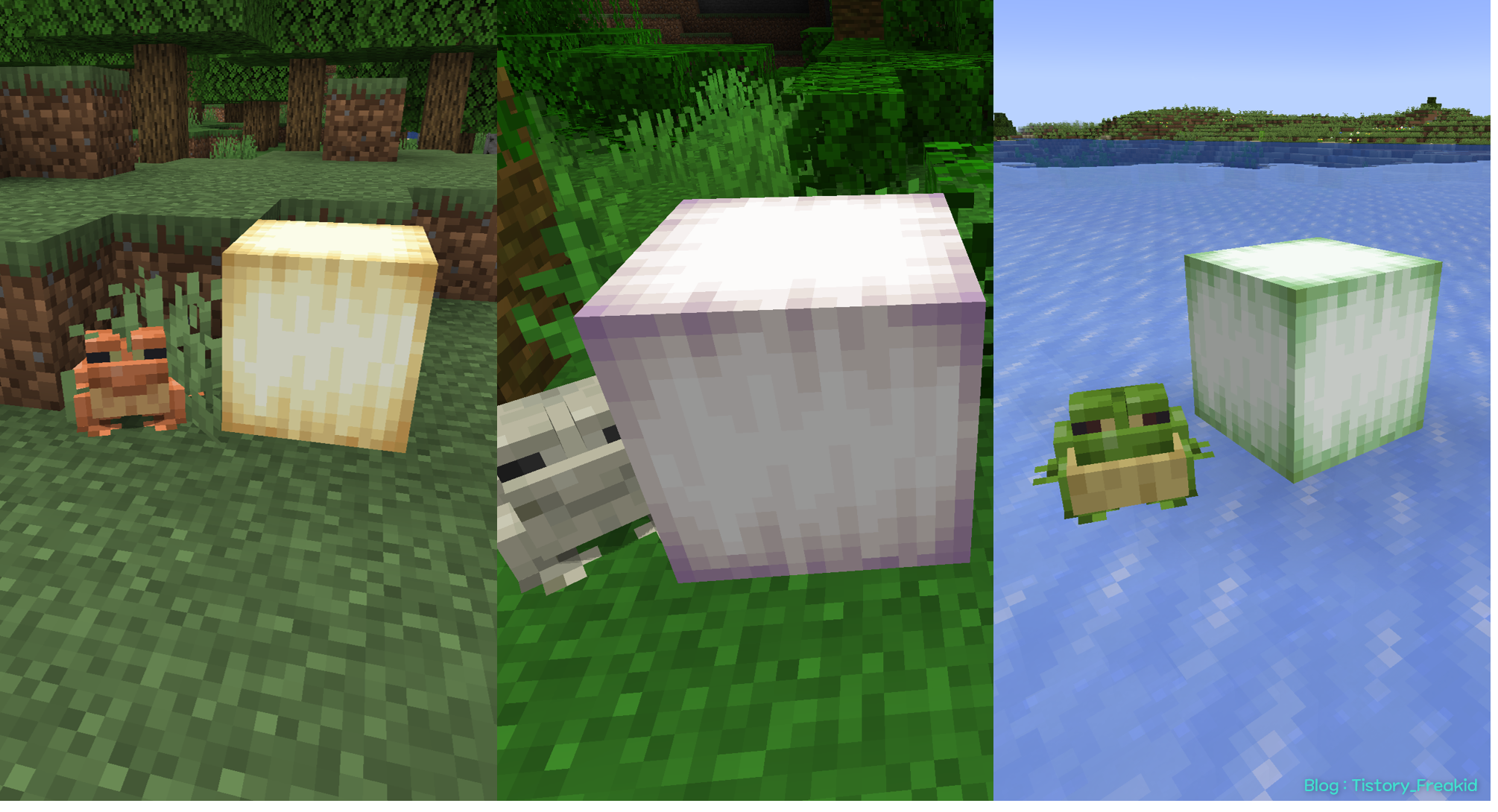 개구리는 앞서 설명했듯 바이옴에 따라 스폰되는 색이 달라진다.